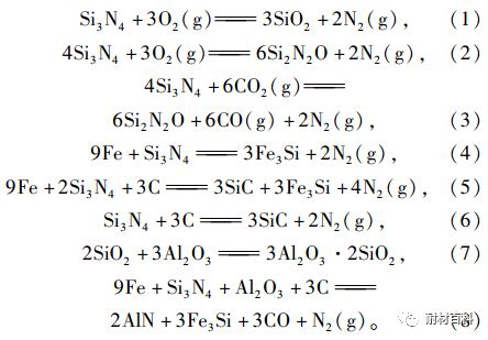加入氮化硅鐵的炮泥在高溫加熱過程中,發(fā)生的反應(yīng)除了瀝青的分解、炭化和助燒結(jié)劑的液相燒結(jié)外,主要反應(yīng)就是氮化硅鐵在含碳材料中的反應(yīng),其氣氛主要是含N2、O2、CO2和CO等的混合氣體。其可能發(fā)生的主要反應(yīng)如下: